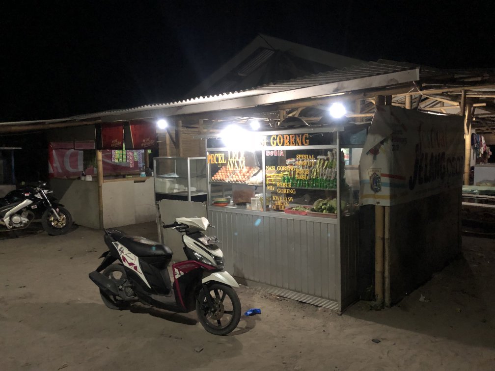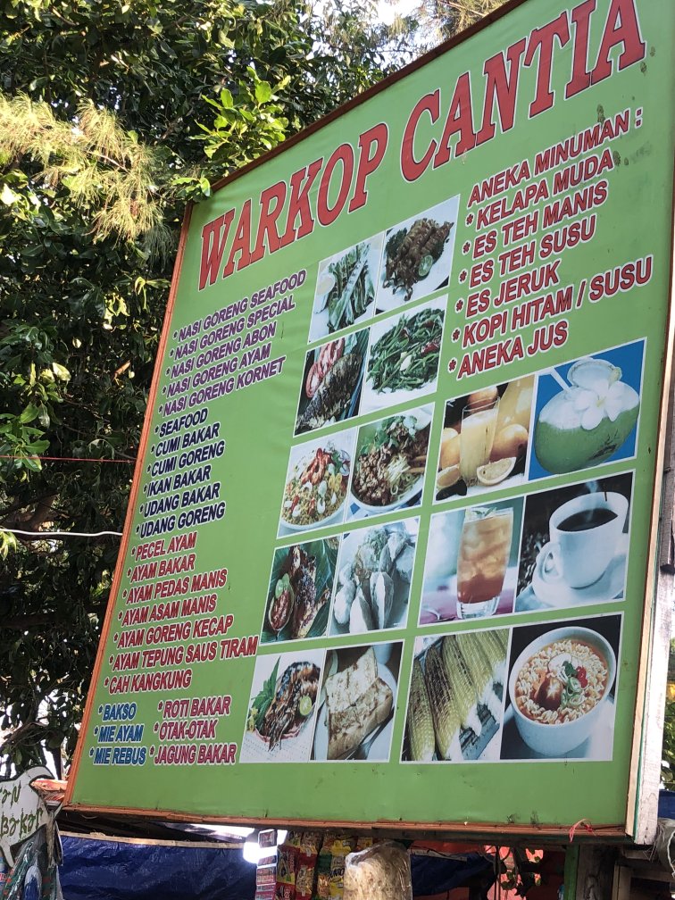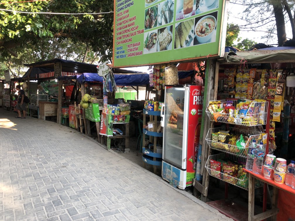 There are large number of food stalls and outlets around the island. Most of them can be found near the bridge - "Jembatan Cinta", near the port and alongside the main street running on south side connecting the port, the Sunset beach and the bridge. They offer local dishes like: