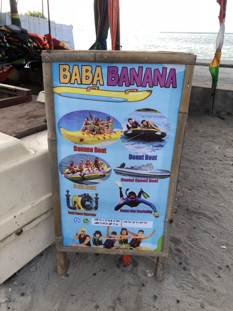 Various water activities are available from the shops located near the Bridge (Jembatan Cinta). Please check the details below. Please remember that all prices are valid at the time of witting, they can change anytime, and they are always negotiable!